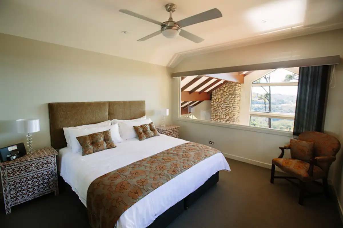 The entire second floor is a private master suite, complete with a spa ensuite and a viewing window over the lounge, dining area, and sweeping valley views.